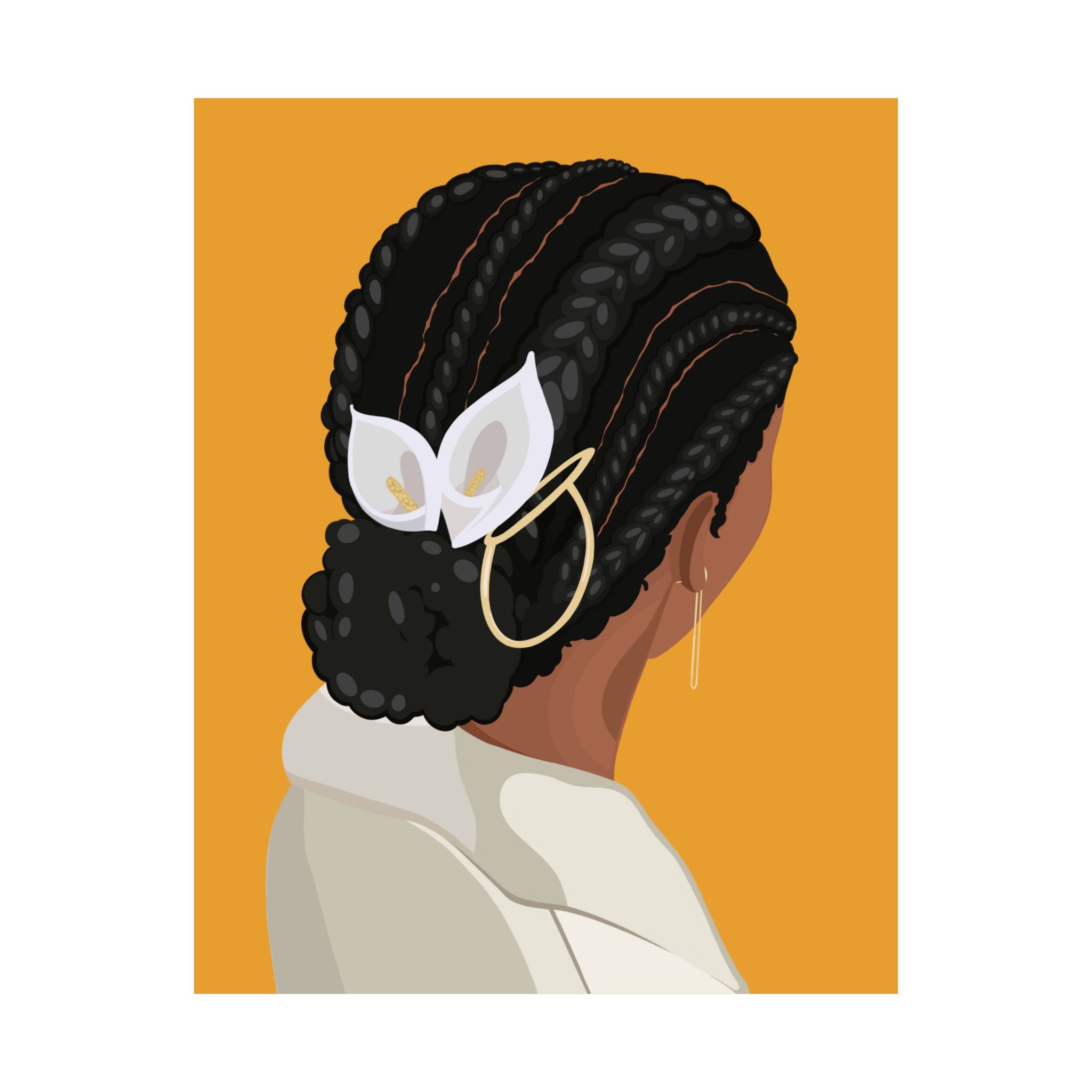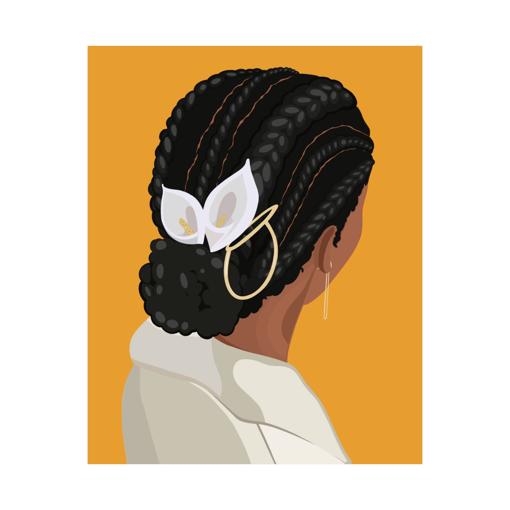 This artwork celebrates historic cornrows, paying homage to their cultural significance for women of color. The piece features a striking depiction of intricately braided cornrows, which once merely served as a dependable protective style for labor-intensive days to now a high-fashion staple on runways for all hair types. This portrait symbolizes resilience, tradition, and artistry behind the style. The intricate pairing of these cornrows with vibrant floral Calla Lilies elevates the style to a place of pure magnificence and beauty.